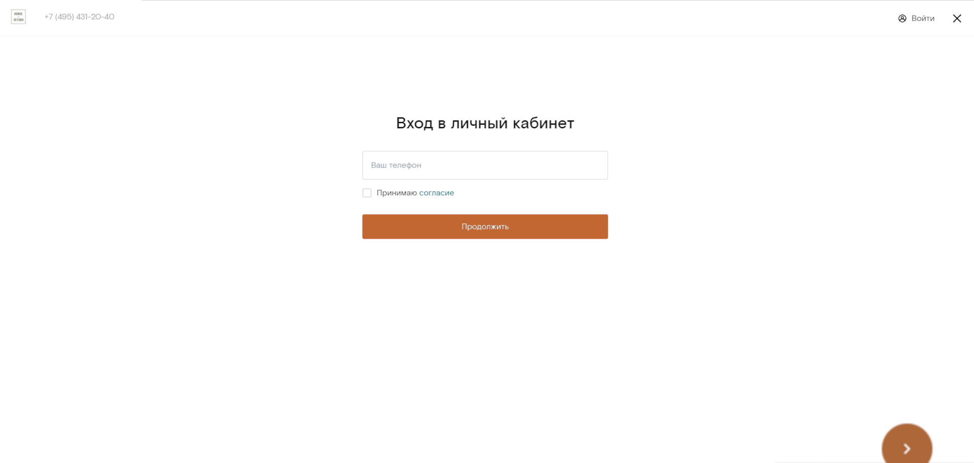 Шаг 1. Для входа в личный кабинет используйте номер телефона, указанный в ДДУ, как основной (на указанный номер вам придет SMS-сообщение с паролем для входа).